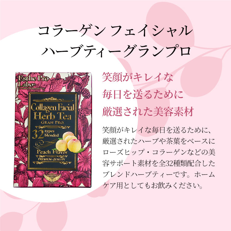 ▼コラーゲン フェイシャル ハーブティー グランプロ 笑顔がキレイな毎日を送るために、厳選されたハーブや茶葉をベースにローズヒップ、コラーゲンなどの美容サポート素材を全32種類配合したブレンドハーブティーです。